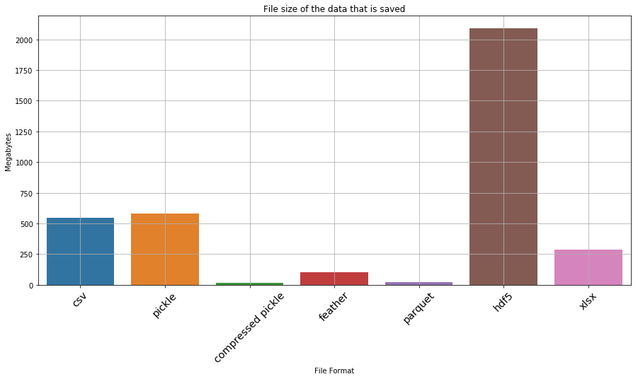 A few observations from the above test: * The worst thing that can be used is xlsx, csv and hdf5! CSV and Excel formats takes an insanely long time to read and write. HSF5 is quick to load, but is a whooping 2GB on disk! * A compressed pickle seems the ideal for space constrained IO – is the second slowest to load and save (although not by a large margin), but only takes up 15mb; * Feather is the ideal one for a tradeoff of both on disk space and IO. It is the fastest when it comes to IO (2.44x faster to read than second best which is parquet, and 1.5x faster to write than parquet), but takes up 100mb on disk, which isn’t small. * If space/size is a bit more of a consideration but speed is more important, then the best is parquet. However the ballance between IO speed and size makes it best compared to a compressed pickle. Parquet is a bit larger in size (20mb instead of 14mb) but it is much faster.